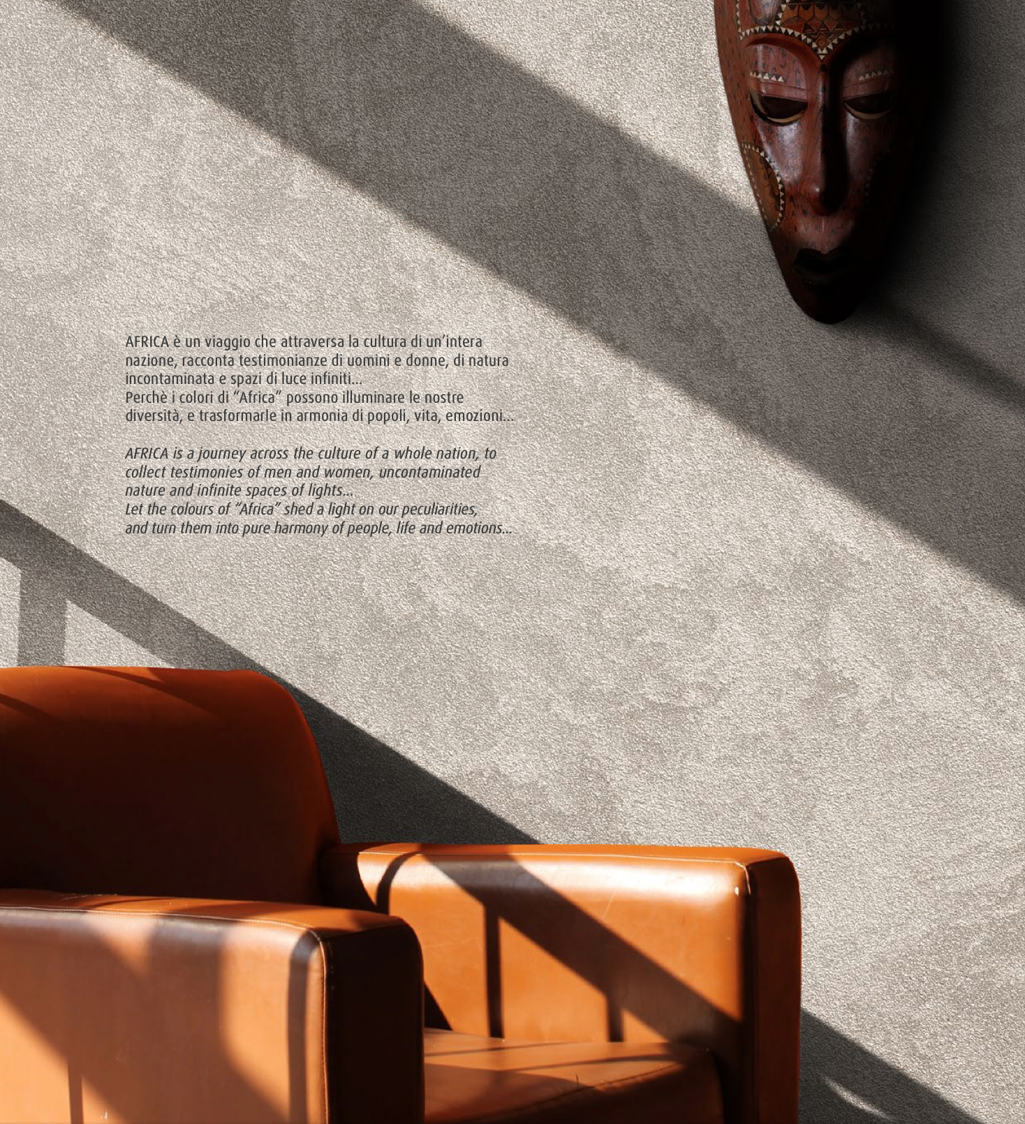 Africa is an interior decorative finish that brings warmth, depth, and movement to modern spaces. Its soft metallic pigments create velvety chromatic effects that shift gently with the light, offering both visual richness and a subtle tactile elegance.