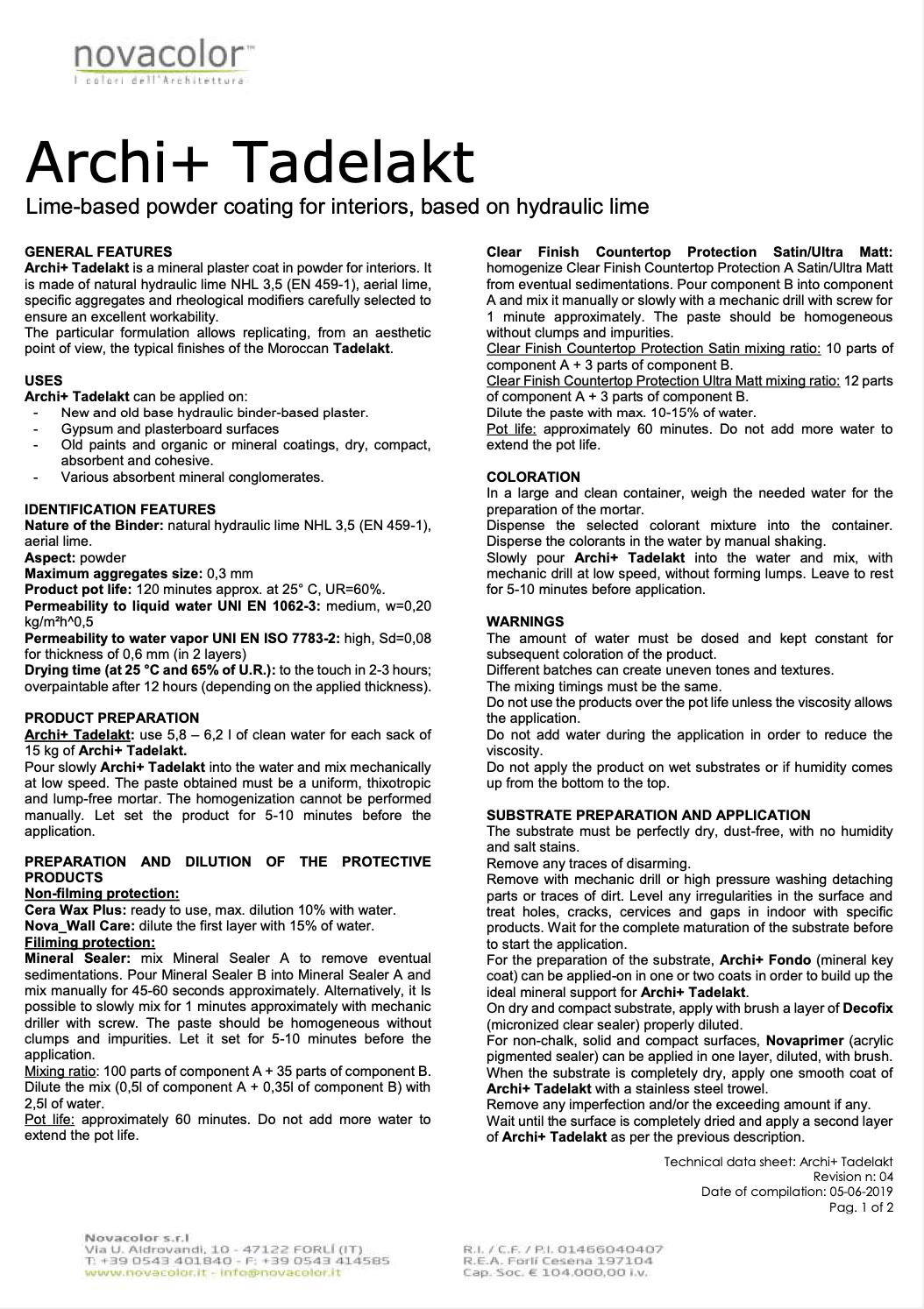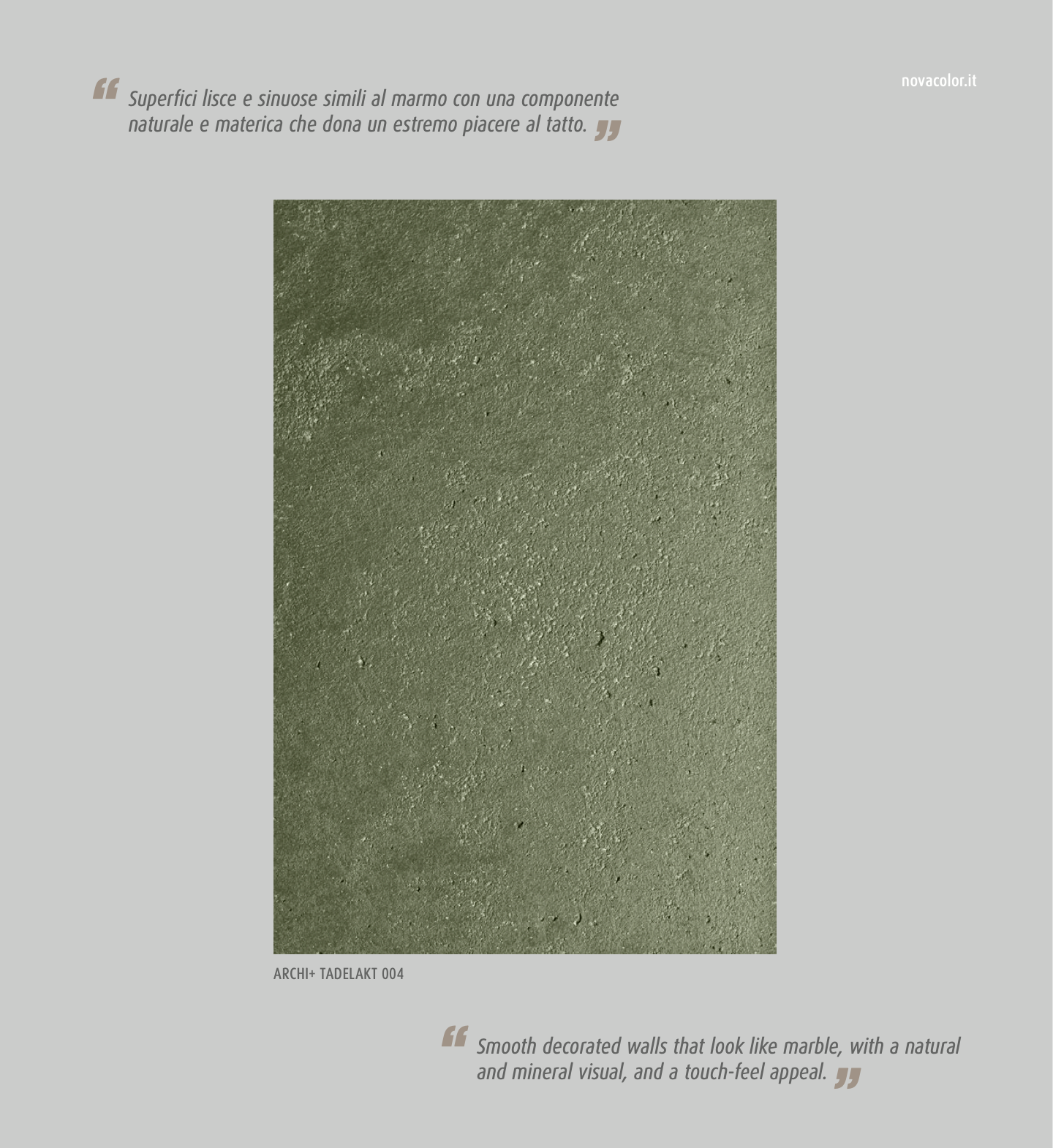 Archi+ Tadelakt is a mineral plaster coat in powder for interiors. It is made of natural hydraulic lime NHL 3,5 (EN 459-1), aerial lime, specific aggregates and rheological modifiers carefully selected to ensure an excellent workability. The particular formulation allows replicating, from an aesthetic point of view, the typical finishes of the Moroccan Tadelakt.