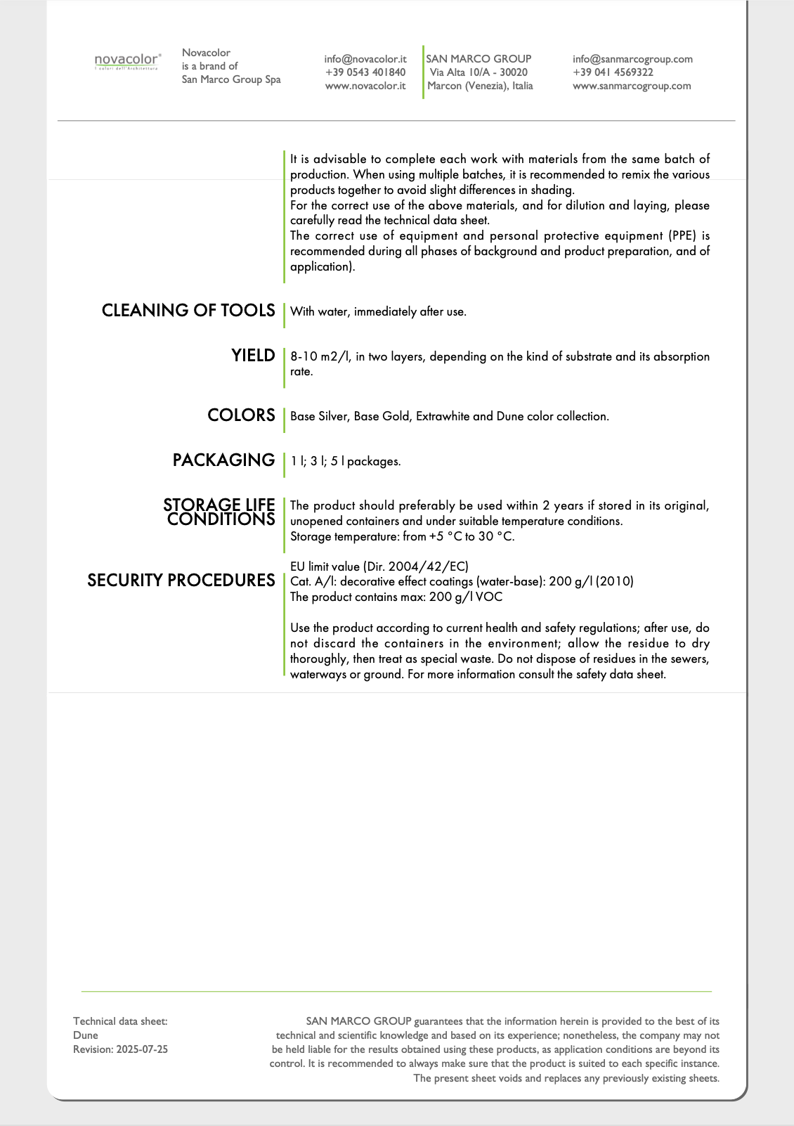 Dune also reflects the environmental commitment of Novacolor. Its formulation incorporates an innovative binder derived from sustainable biomass, partially replacing fossil-based raw materials. This responsible approach helps reduce carbon footprint and is verified through the REDcert²-certified mass balance system, ensuring environmental integrity without compromising performance or aesthetic excellence.