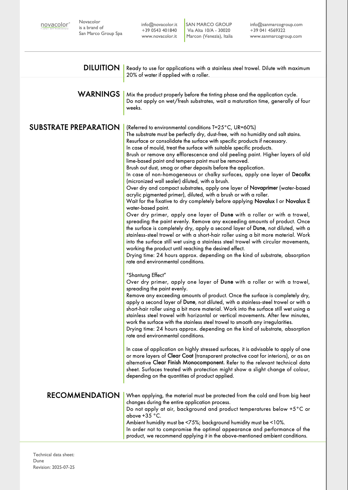 Dune also reflects the environmental commitment of Novacolor. Its formulation incorporates an innovative binder derived from sustainable biomass, partially replacing fossil-based raw materials. This responsible approach helps reduce carbon footprint and is verified through the REDcert²-certified mass balance system, ensuring environmental integrity without compromising performance or aesthetic excellence.