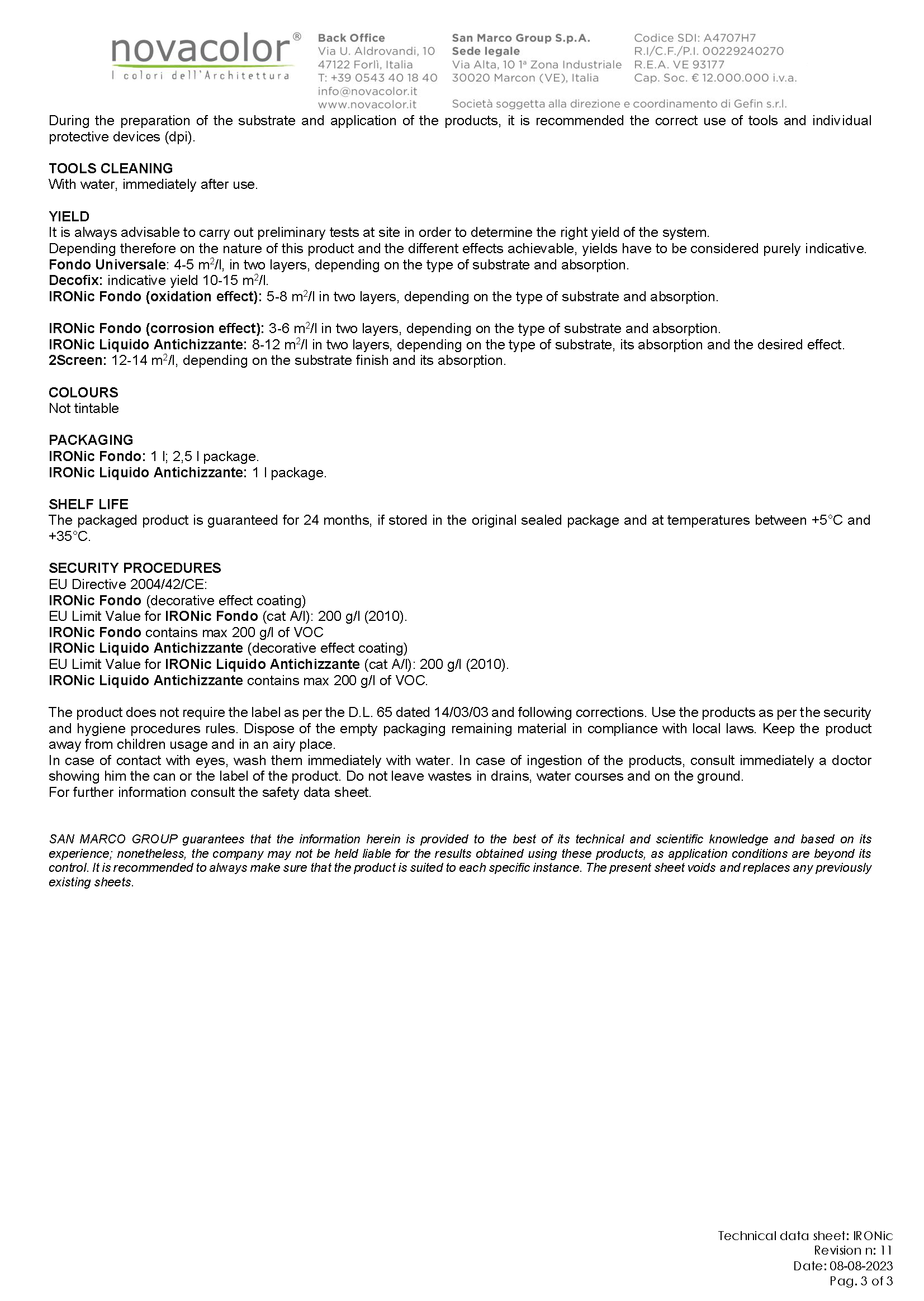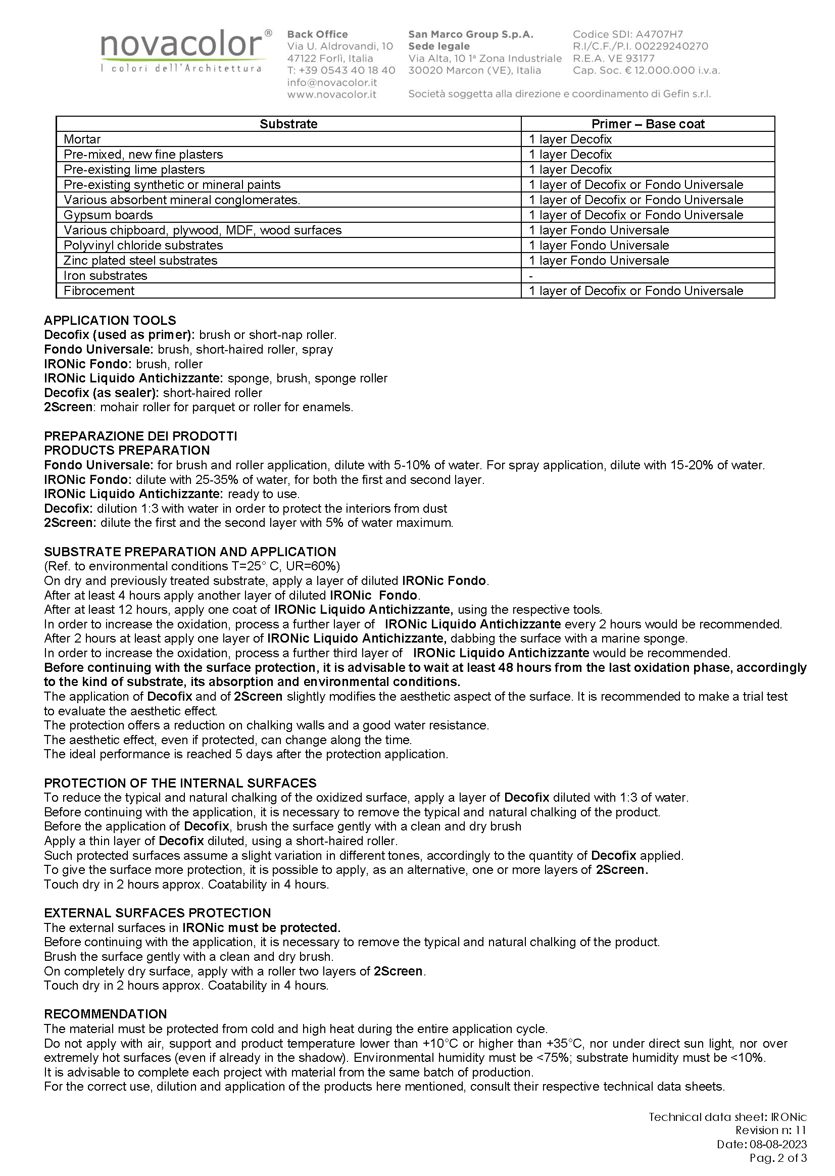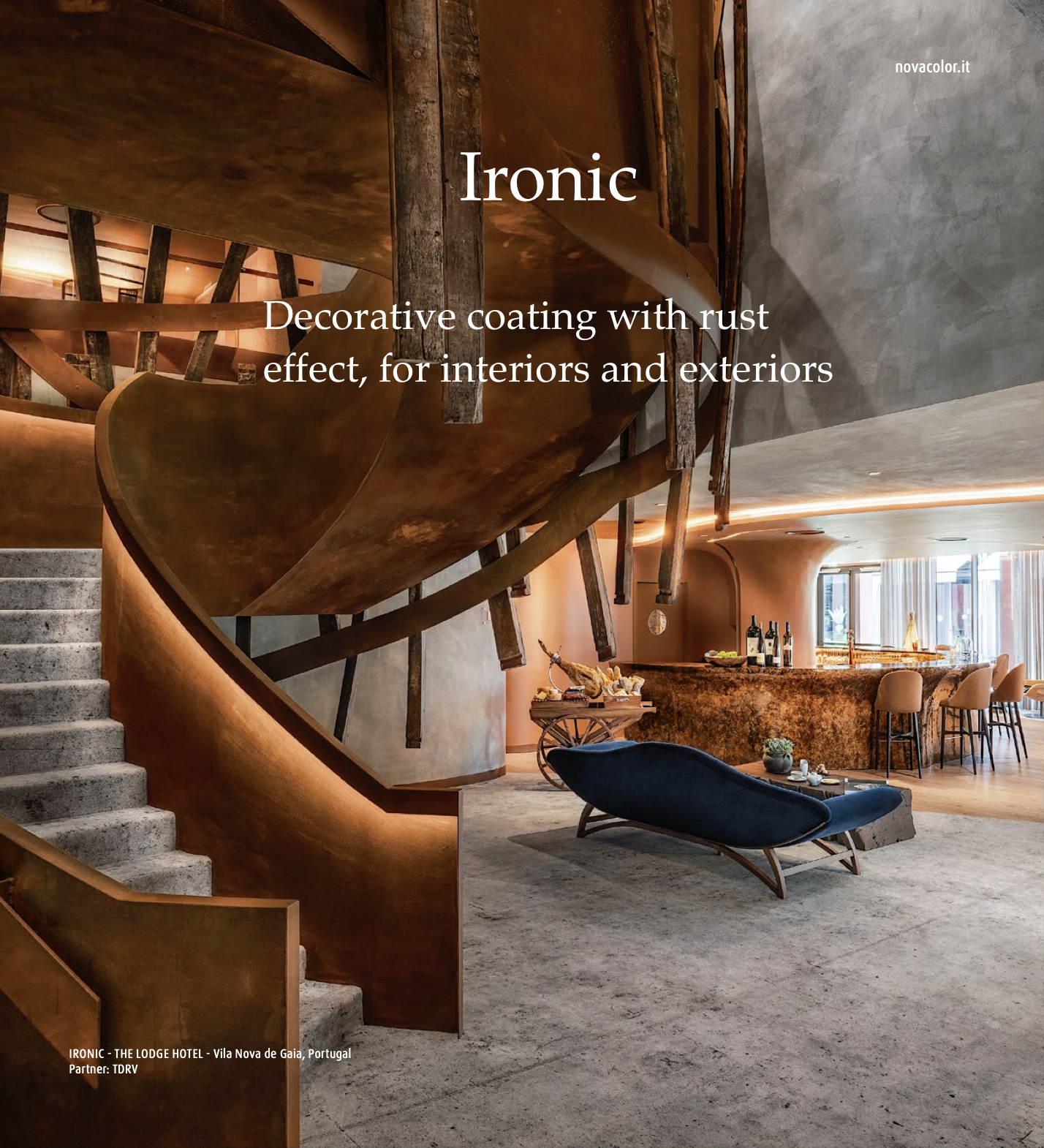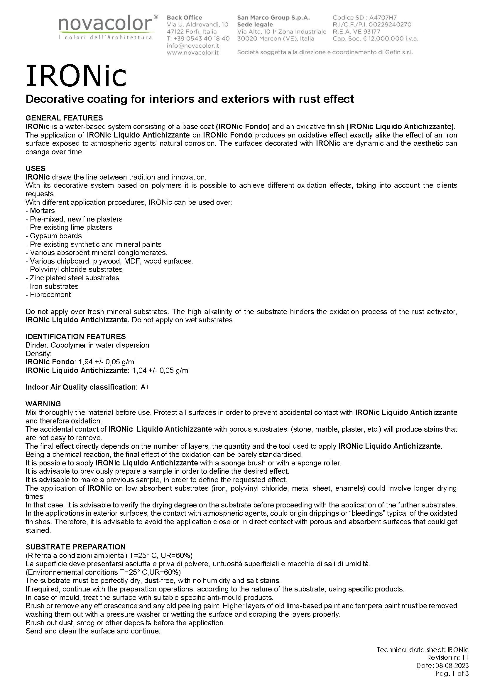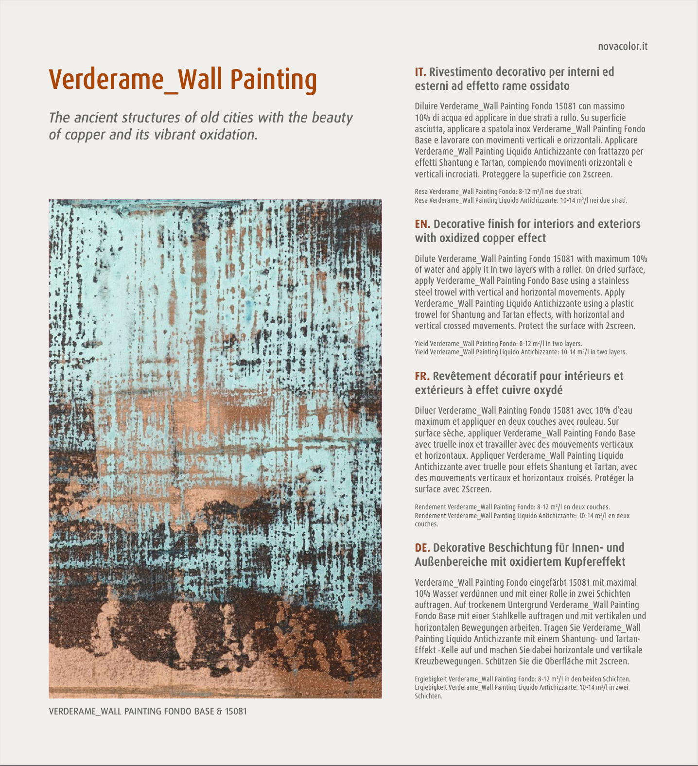 Ironic:Ironic is a water-based system consisting of a base coat (IRONic Fondo) and an oxidative finish (IRONic Liquid Activator).The application of IRONic Liquid Activator on IRONic Fondo produces an oxidative effect exactly alike the effect of an iron surface exposed to atmospheric agents' natural corrosion. The surfaces decorated with IRONic are dynamic and the aesthetic can change over time. IRONic draws the line between tradition and innovation. With its decorative system based on polymers it is possible to achieve different oxidation effects, taking into account the clients requests.2 Screen:2Screen is a protective, transparent water-based product, for the protection of interior and exterior vertical surfaces, treated with oxidized finishes. Its special formulation creates a thin filmogenic barrier that reduces normal crumbling of the oxidized surfaces and increases resistance to water. 2Screen is recommended for protection of oxidized surfaces, especially for oxidized decorative finishes made using IRONic and Verderame Wall Painting products by Novacolor.