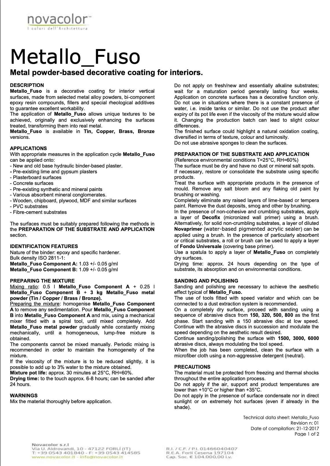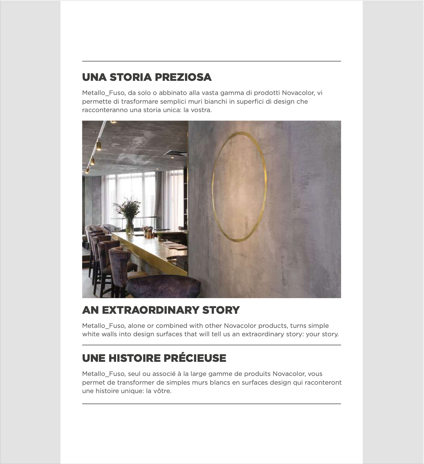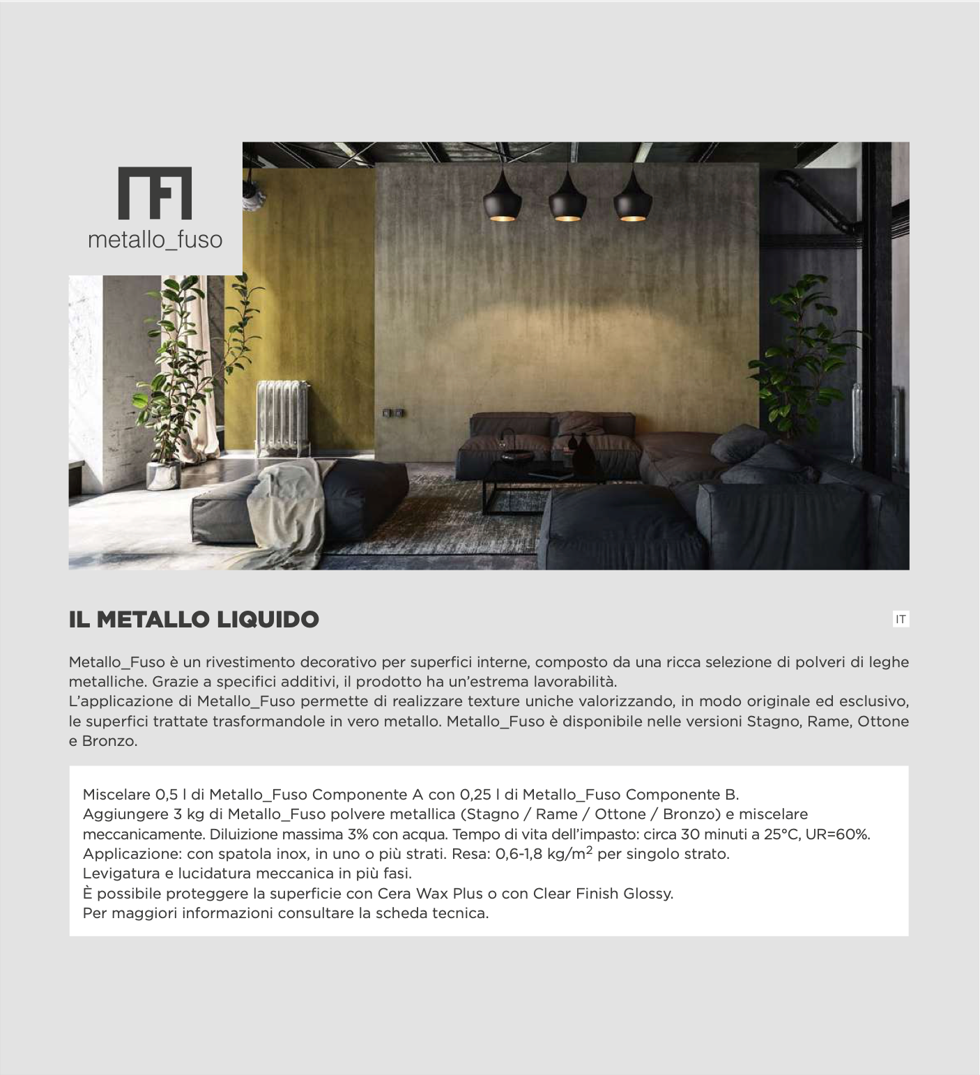 Metallo Fuso is an interior decorative coating that transforms vertical surfaces into authentic expressions of metal. Crafted with selected metal alloy powders, advanced bi-component epoxy resins, refined fillers, and specialized rheological additives, it offers exceptional workability while delivering surfaces of striking depth and realism.