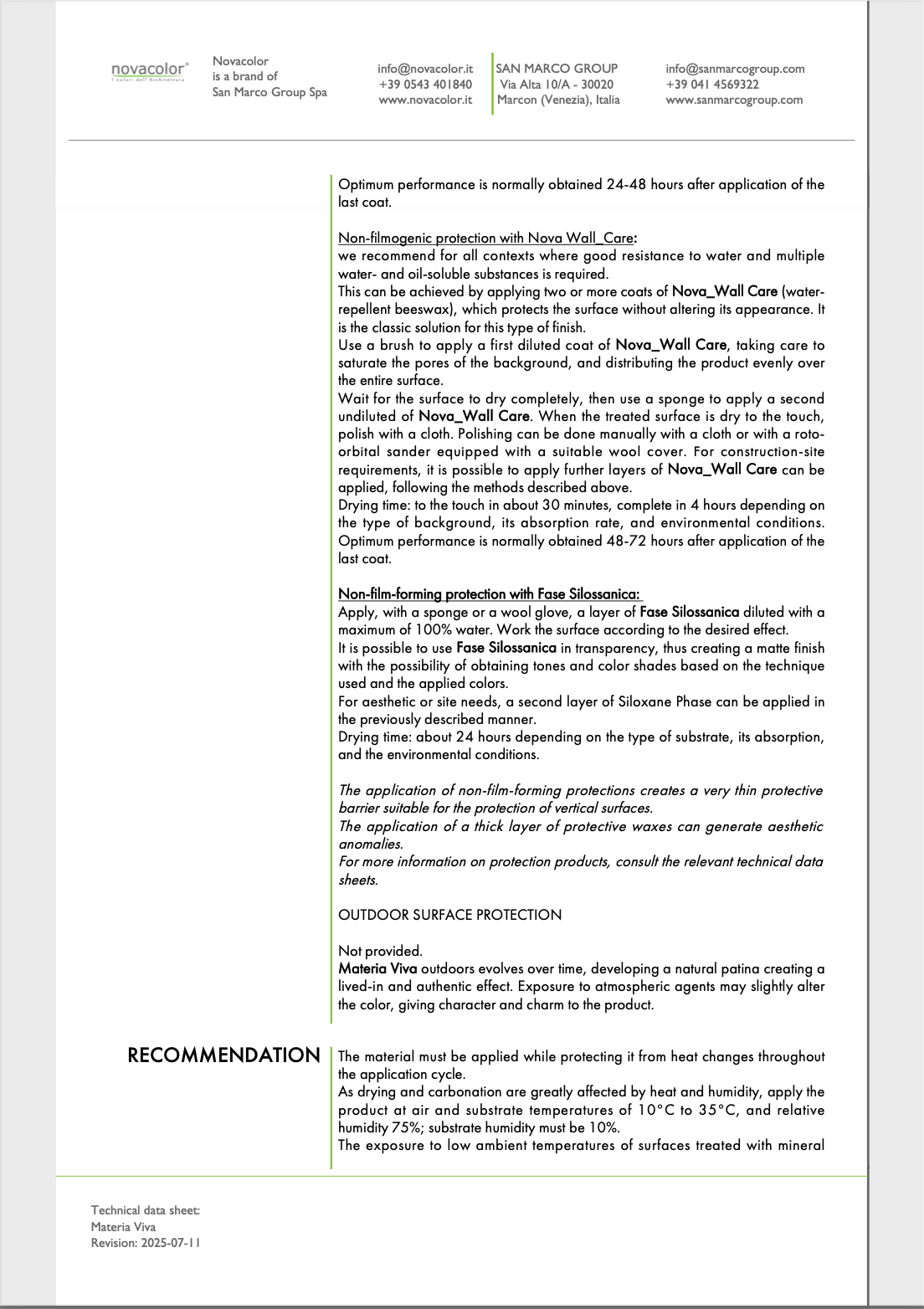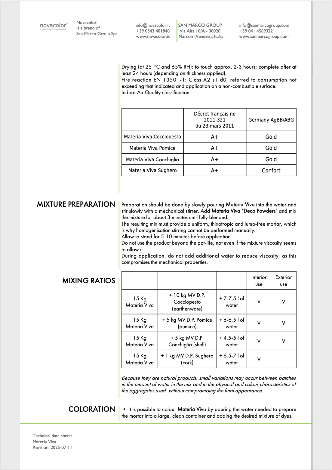 Materia Viva Cocciopesto offers a modern expression of the historic cocciopesto plaster found throughout Italy’s architectural legacy, delivering warm, mineral textures rich in tradition. Materia Viva Conchiglia incorporates delicate shell fragments, creating structured surfaces illuminated by subtle, mother of pearl reflections. Materia Viva Pomice draws inspiration from volcanic stone, evoking the timeless strength and quiet elegance of heritage mortars. Materia Viva Sughero introduces a softer, more tactile dimension, with a compact yet gentle surface that recalls the warmth and texture of natural fibers.