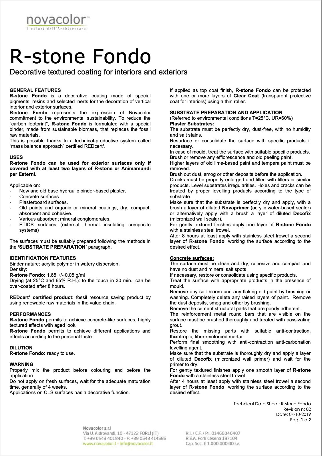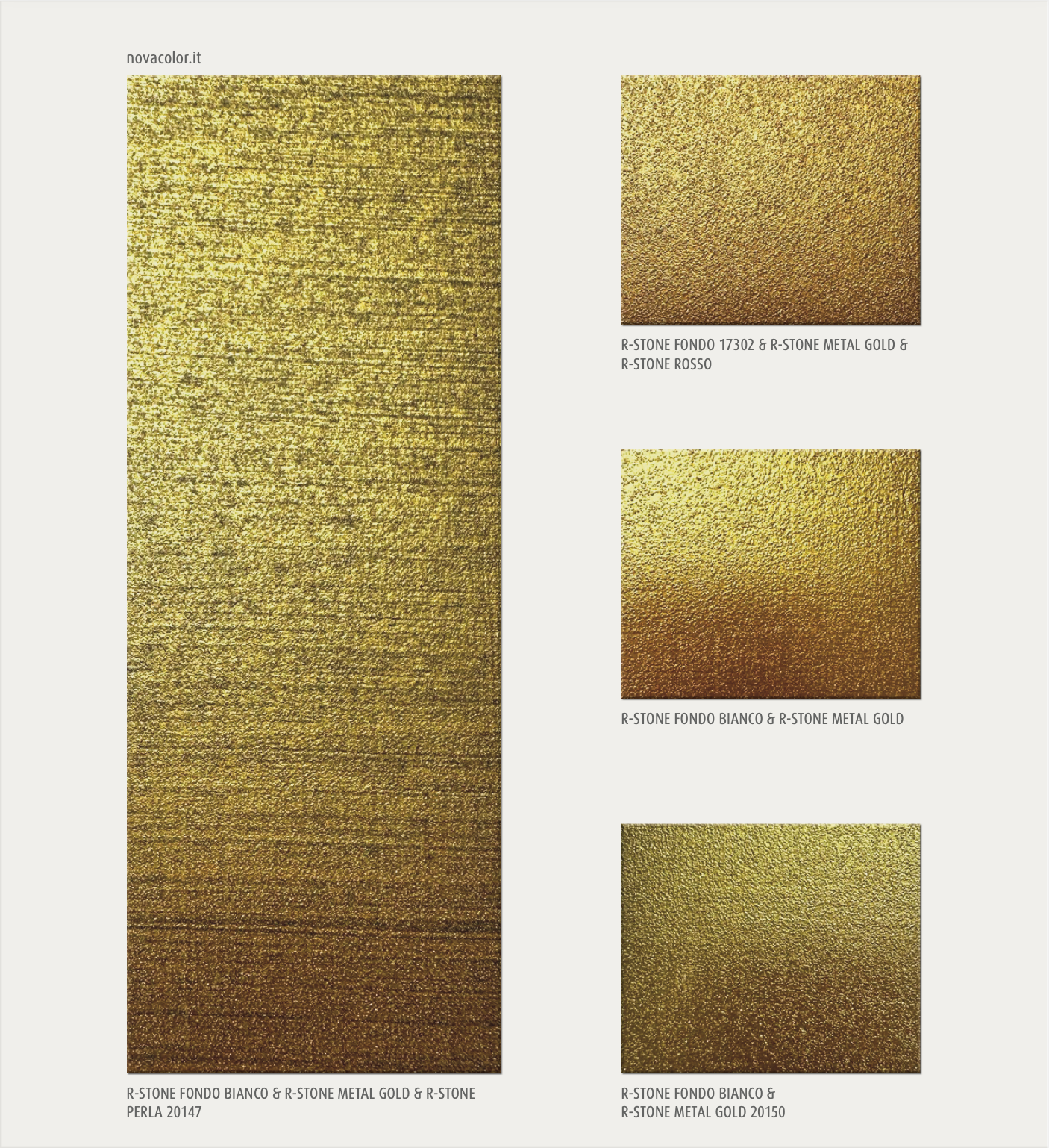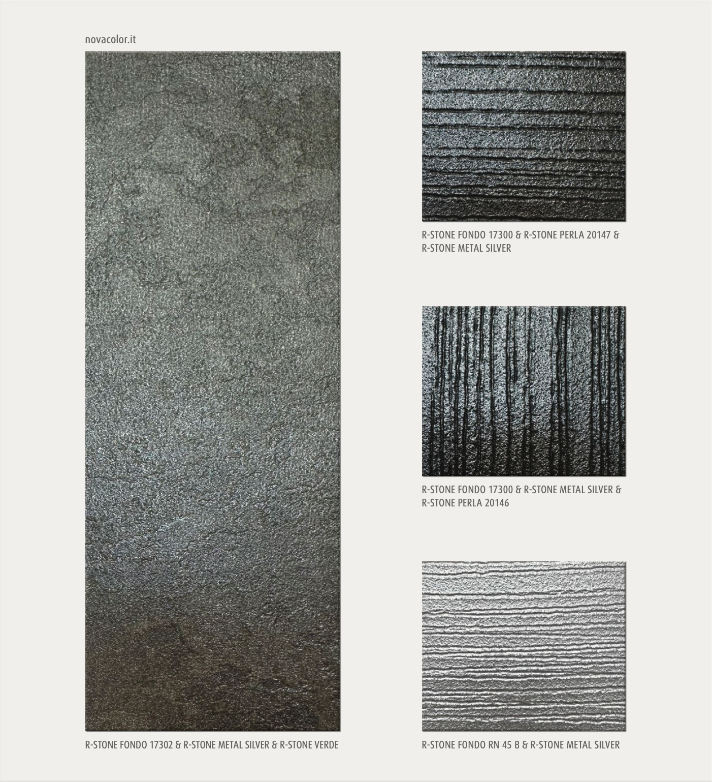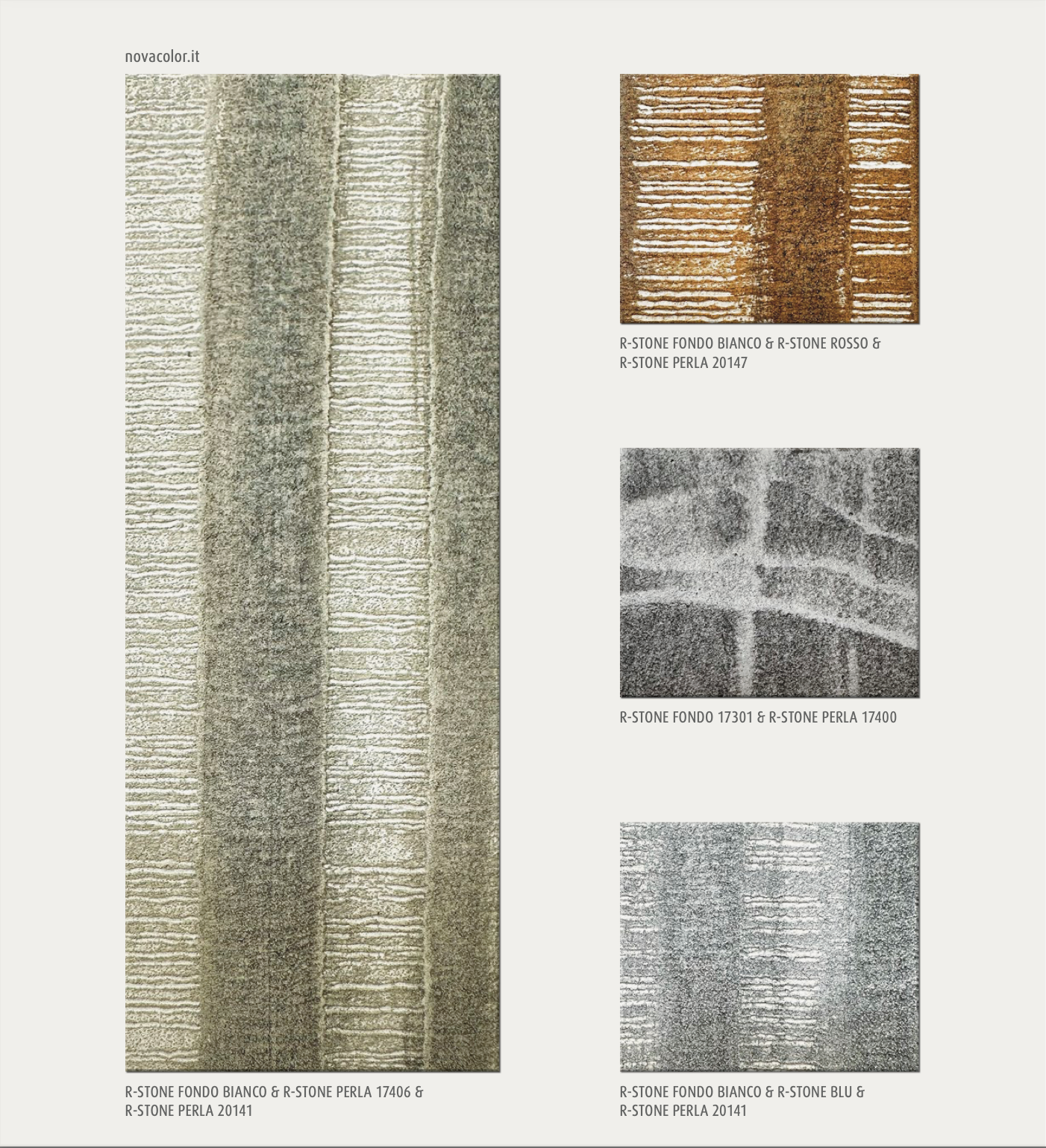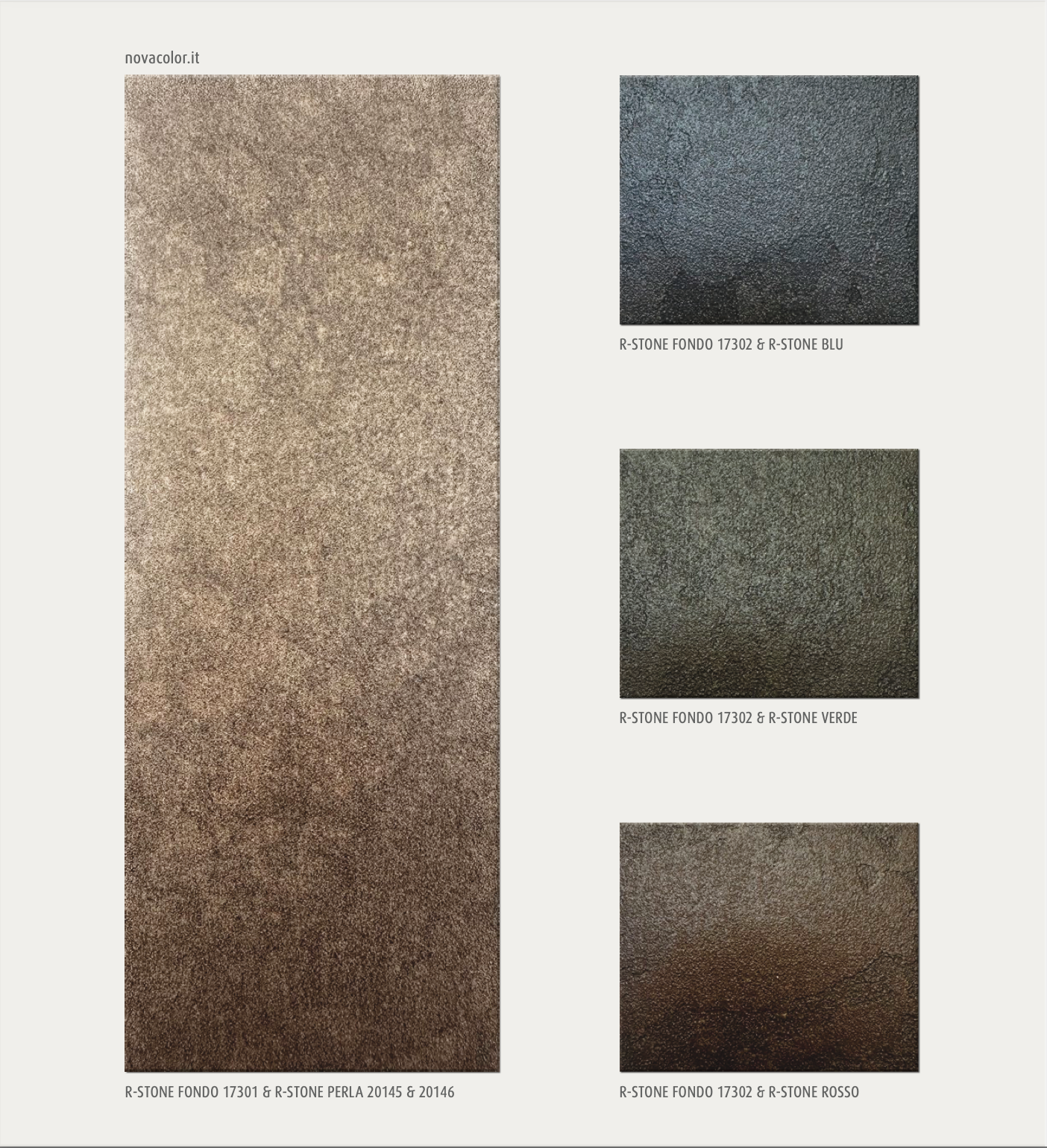 R-stone is a decorative finish with stone and ancient patina effect, available as Rosso, Verde, Blu, Perla, Metal Silver and Metal Gold. It is formulated with selected metallic pigments, unsaponifiable resins and rheological modifiers to guarantee an